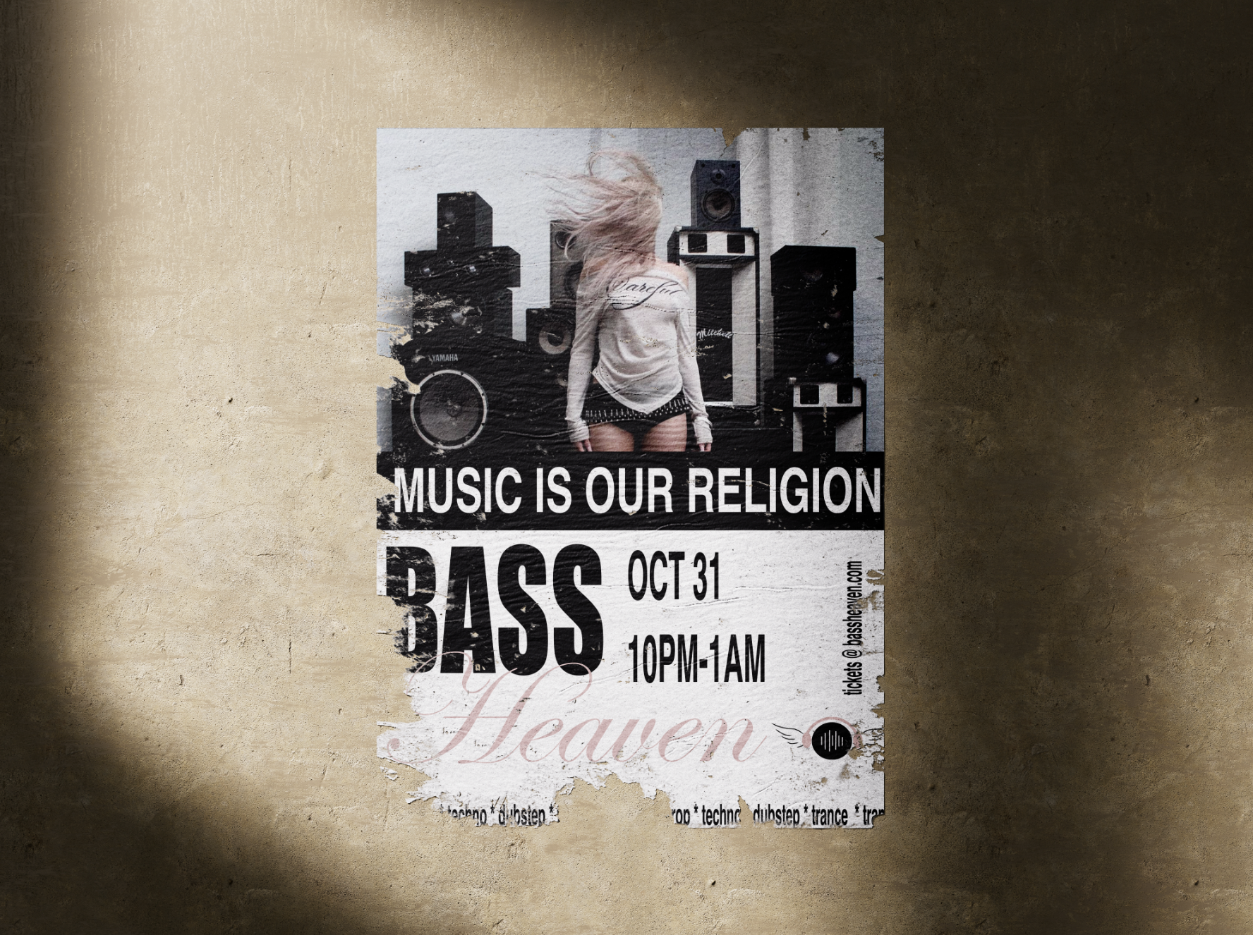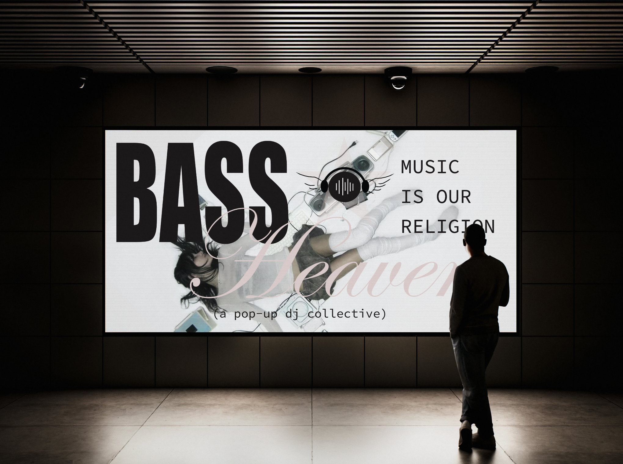 Created as a fictitious brand for this project, Bass Heaven represents a pop-up DJ collective rooted in underground music culture. The concept draws inspiration from the words “music” and “creative,” channeling the energy of Boiler Room–style sets and the expressive atmosphere of live DJ performances. The visual identity aims to balance the weight of bass-driven sound with softer, more playful elements.