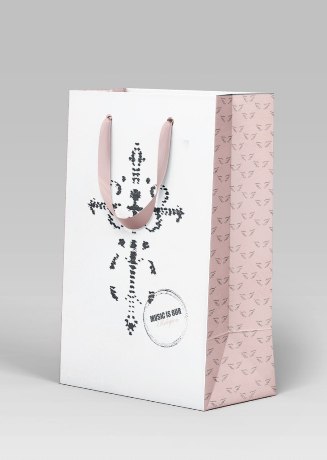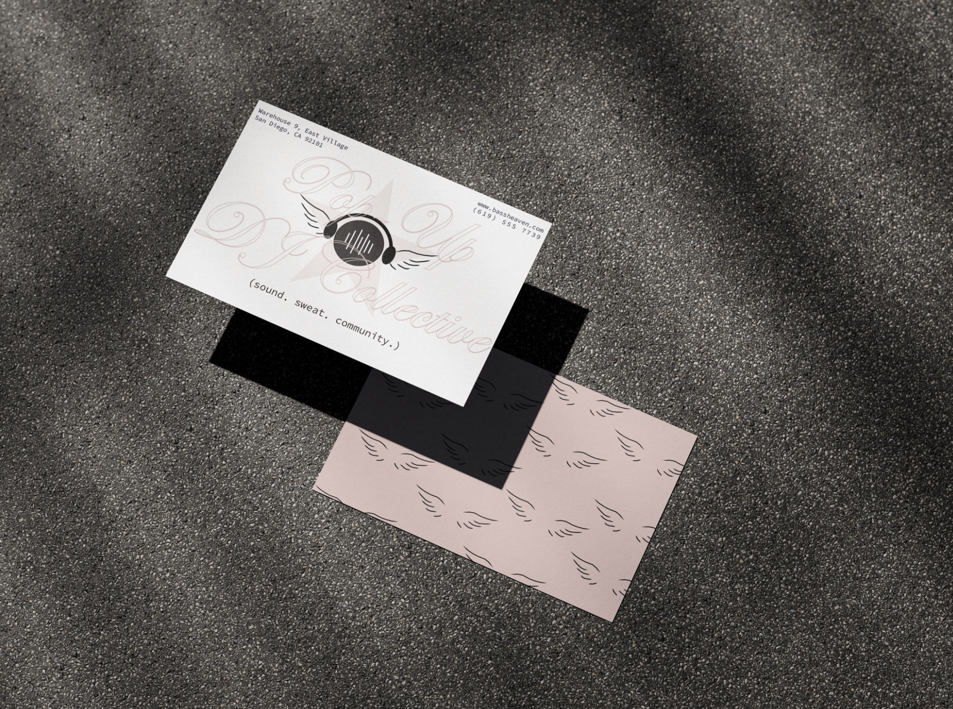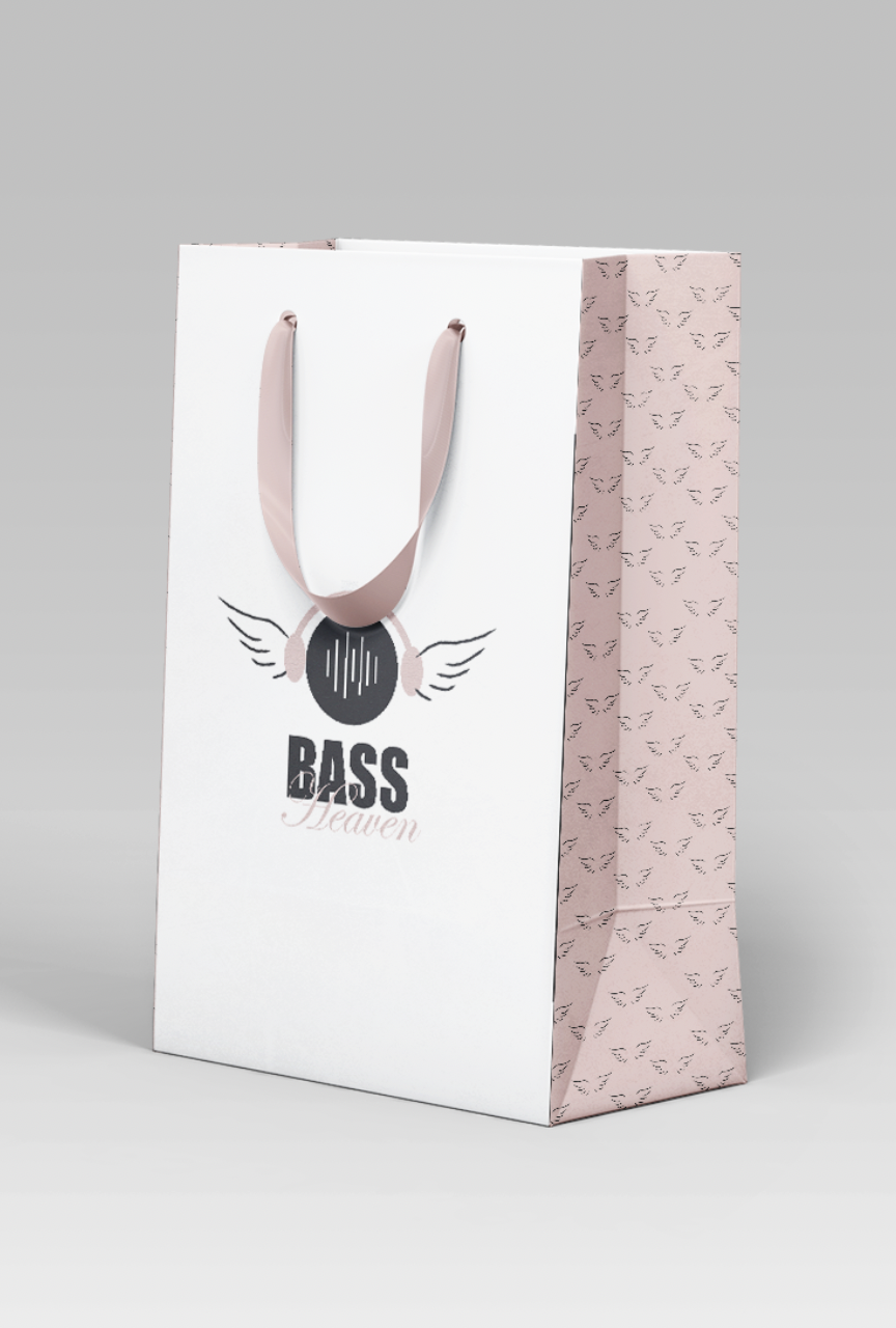 The final identity uses bold black forms paired with muted pink accents and a contrasting combination of script and sans-serif type to highlight the duality between “bass” and “heaven.” Wing and headphone motifs reinforce the blend of heavy sound and soft visual expression. The brand system extends seamlessly across applications, including packaging, patterns, advertising, and merch, creating a recognizable and flexible visual language for the collective.