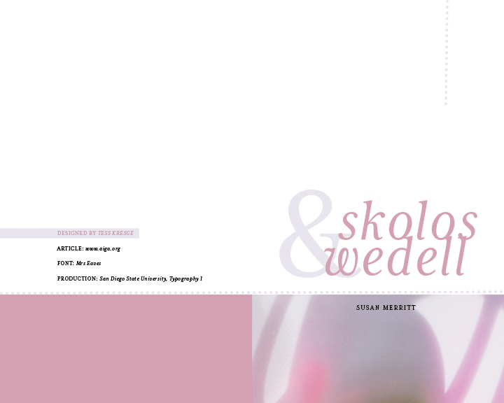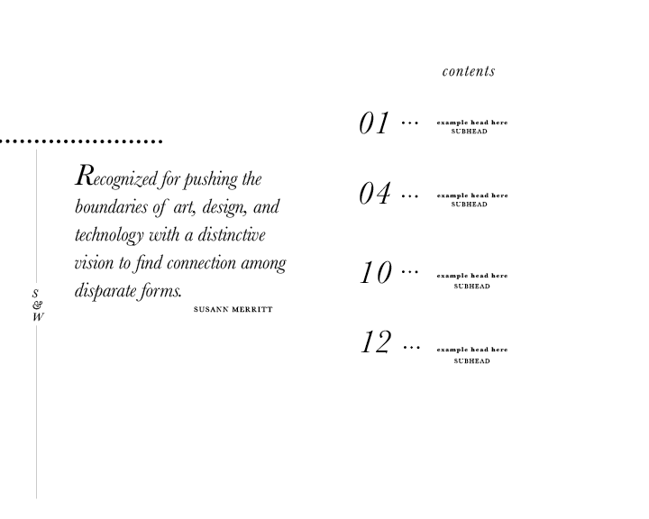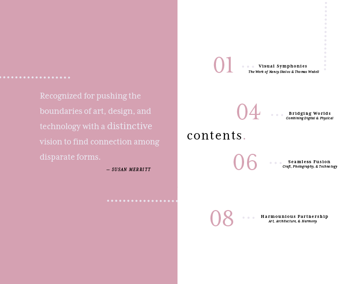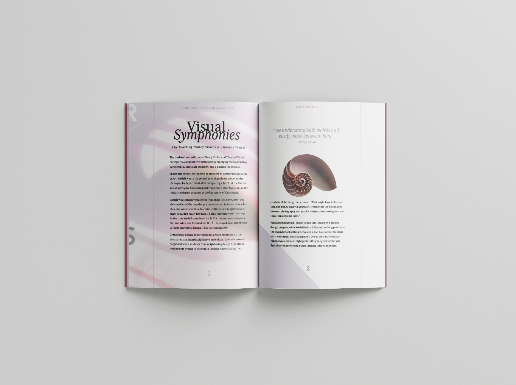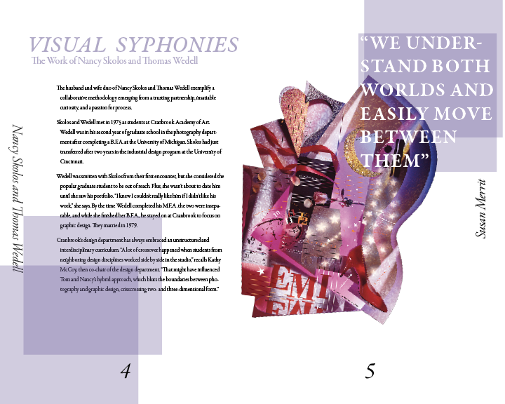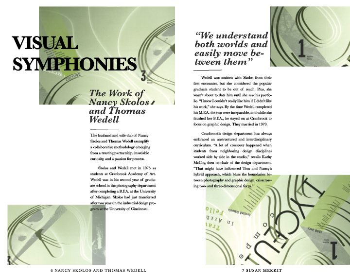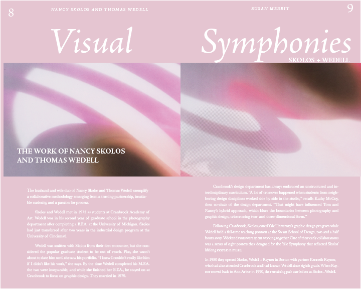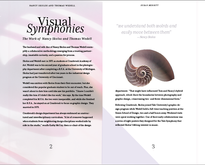 This project focused on applying core typographic principles to a concise, multi-page book. The content—written by Susan Merritt—explores the work and lives of married design duo and AIGA finalists Nancy Skolos and Thomas Wedell. The featured imagery showcases their design pieces, while a cohesive visual system ties the book together, ensuring clarity, consistency, and an intuitive reading experience.